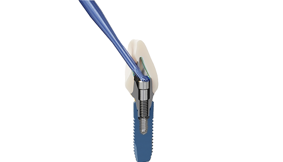 Angling the screw access channel allows the screw access hole to be optimally positioned, improving the esthetics and the installation procedure of the ZimVie CustomBase solution.