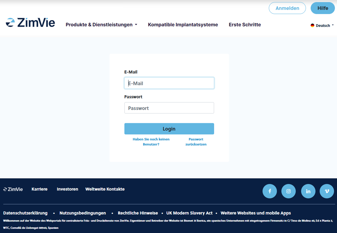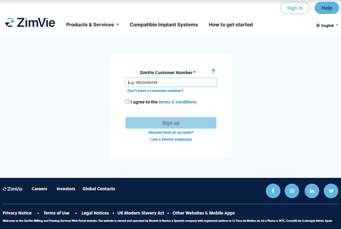 Register as a new customer: If you are not a ZimVie Customer (i.e. you have not used any of our services or purchased any of our products) and you do not have a Customer Number, then we will need to add your information into our internal database before you can log in and create your first project with us!