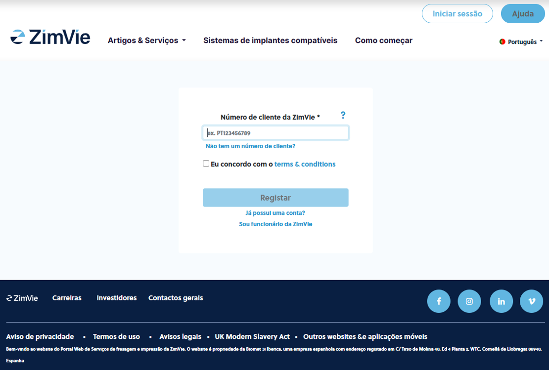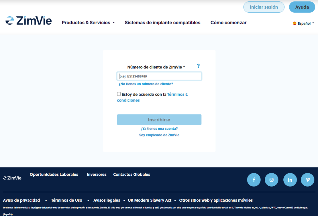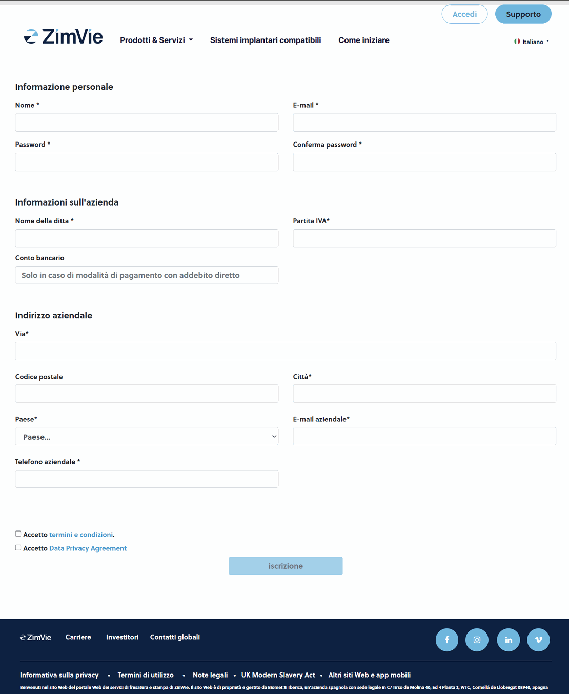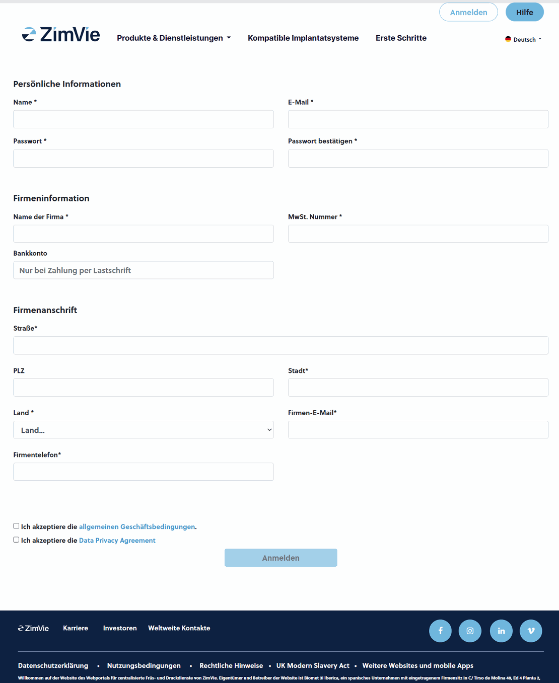 - To become a ZimVie customer you have to provide your information: Name, Email, create a password, and company information (i.e. Company name, company e-mail, phone, identification number, and address)