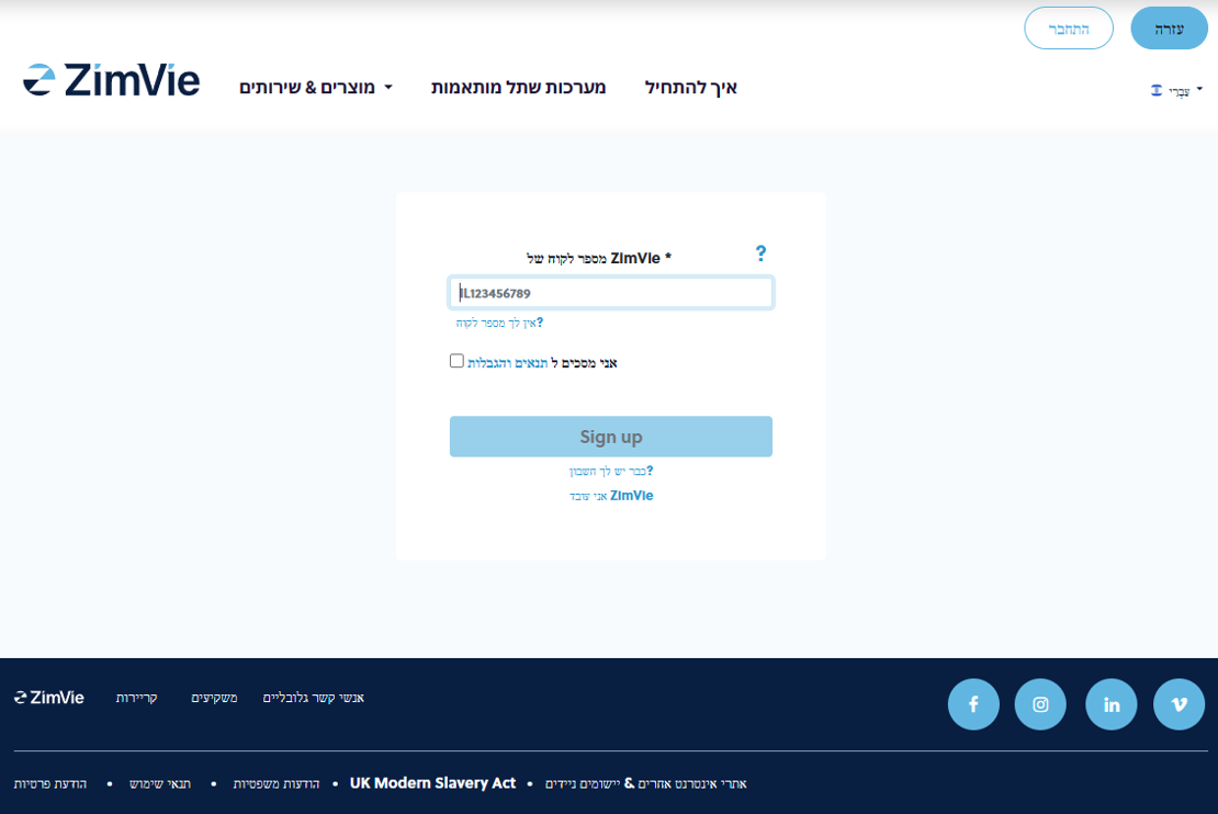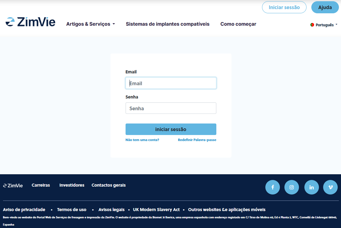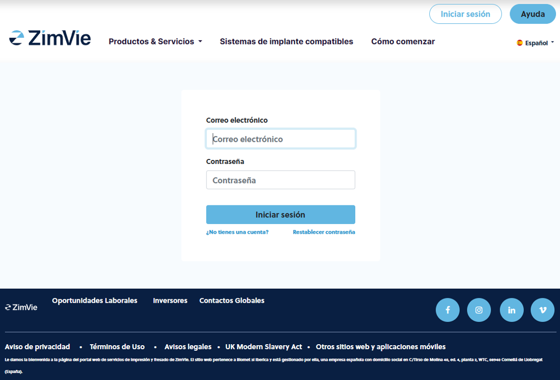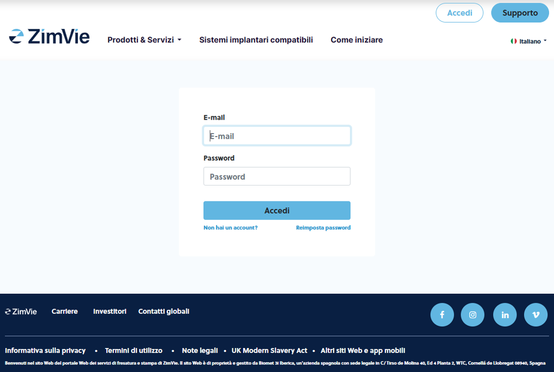 - To become a ZimVie customer you have to provide your information: Name, Email, create a password, and company information (i.e. Company name, company e-mail, phone, identification number, and address)