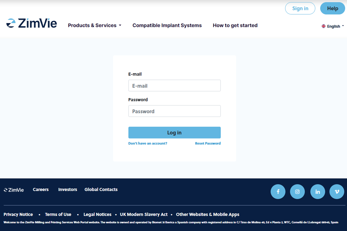 Log in with your existing email and password if you have previously used ZimVie Milling Services